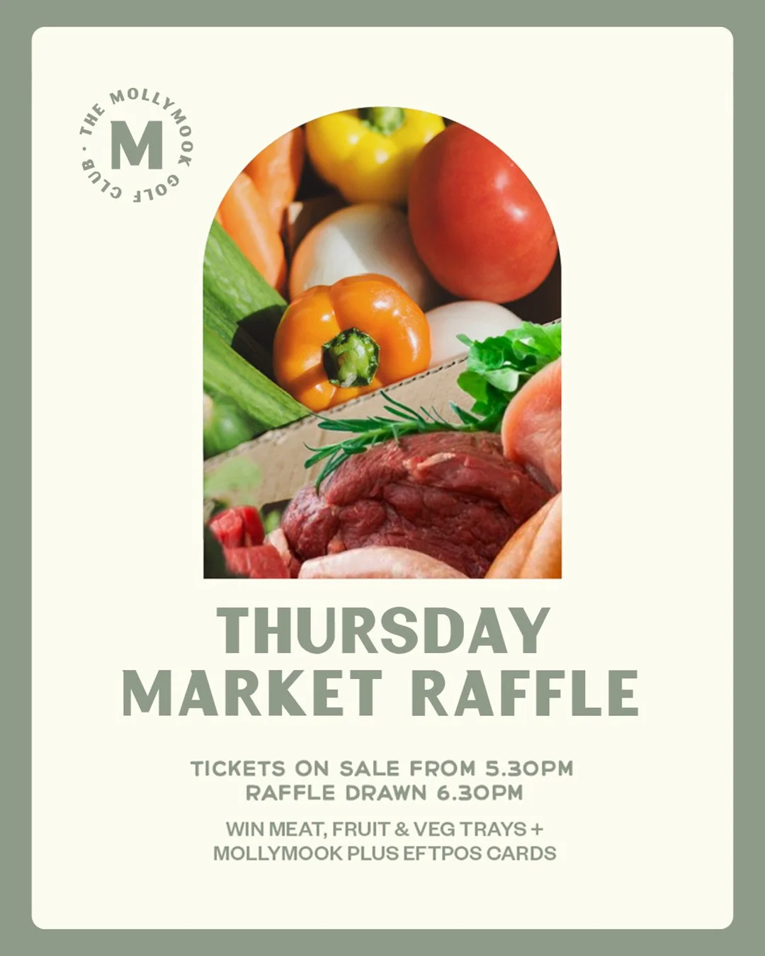 Our Market Raffle gives you the chance to WIN some awesome prizes… Meat trays, Fruit & Vegetable baskets, and Mollymook Plus EFTPOS cards are all up for grabs. Every Thursday night!
